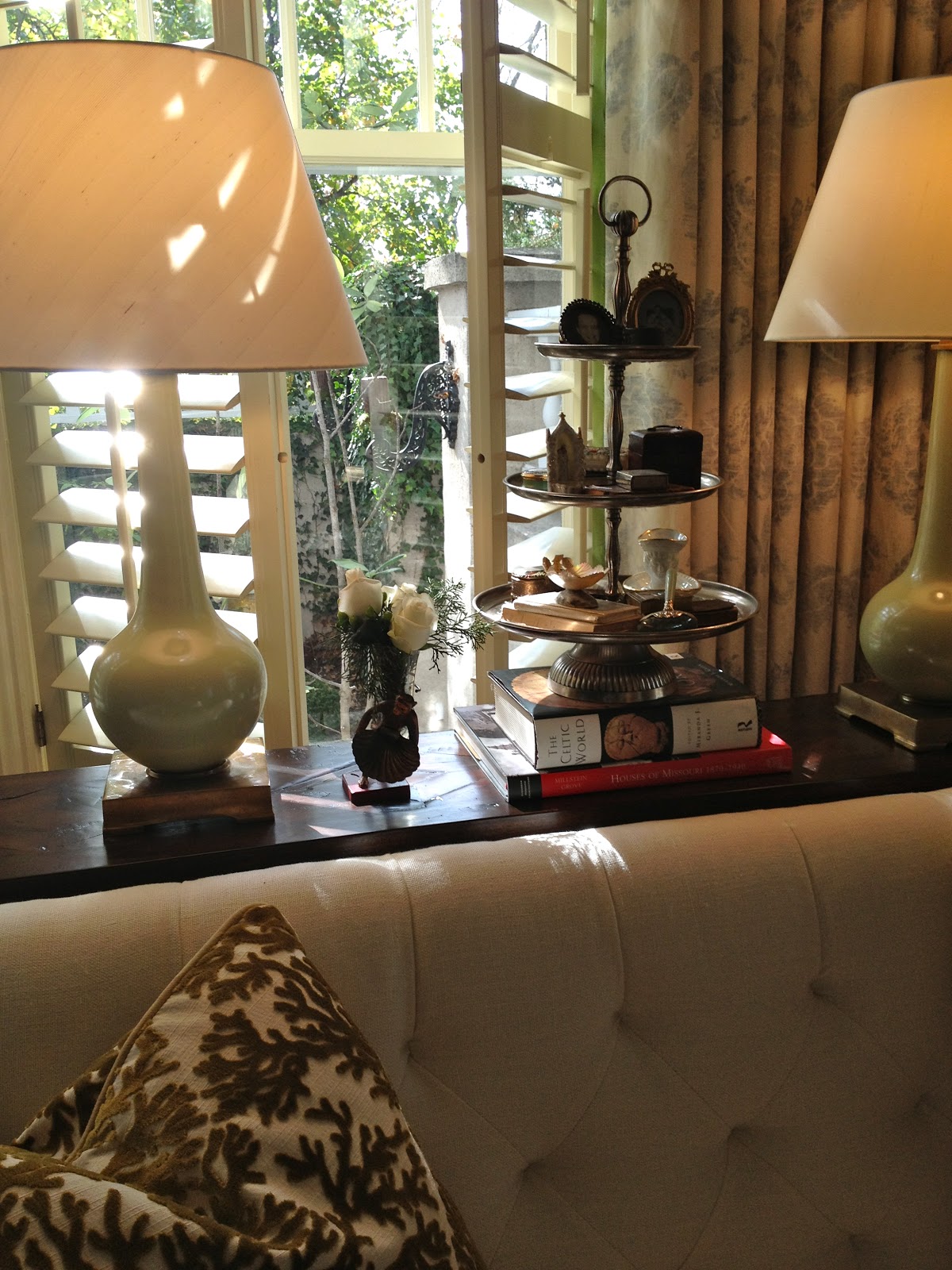 Look at this easy layering!! Just a silver tray- books and majolica plate!
